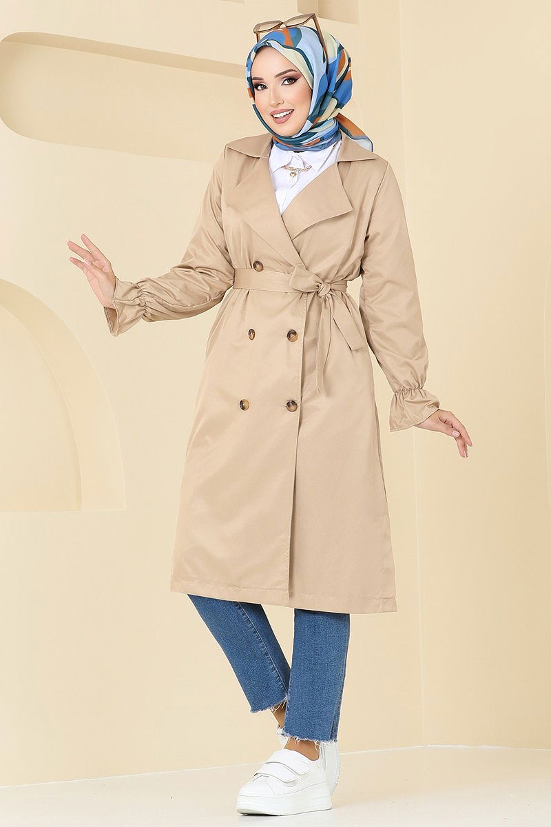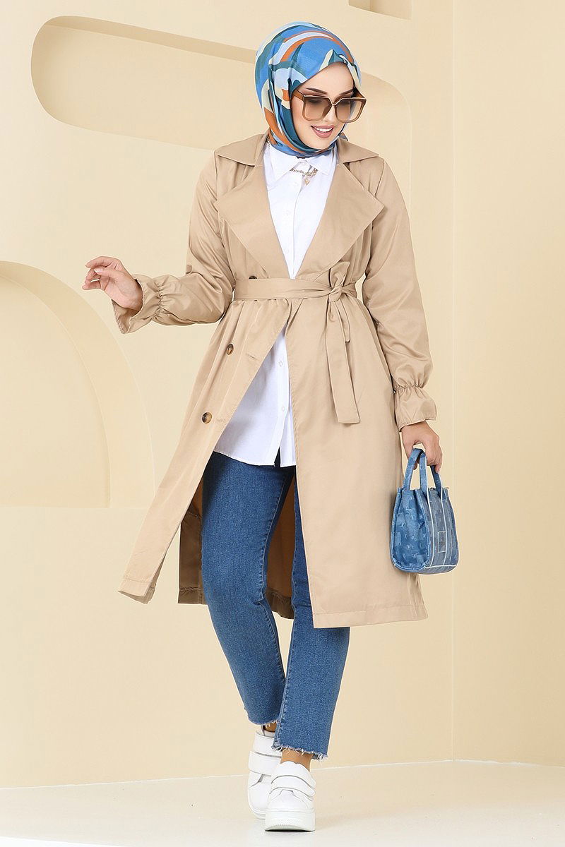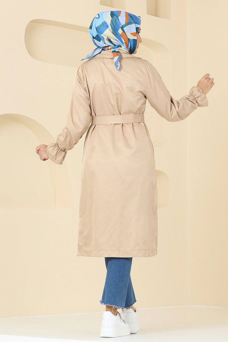 Manşeti Lastikli Trençkot, dört mevsim kullanıma uygun tesettür giyim ürünüdür. 30 derecede sıkma yapılmadan yıkanmalıdır ve birinci sınıf Soft kumaştan imal edilmiştir. Ürün, kruvaze yaka ve önden düğmeli tasarıma sahiptir. Trençkot yandan yırtmaçlı ve astarsızdır. Ürünün üzerindeki örneğin bedeni M'dir. Kemerin dalgalanmaması için iki ucu dikilmiş, orta kısım boş (dikişsiz) bırakılmıştır. Kemer ürüne dahildir ve isteğe bağlı kullanılabilir. Ayrıca, manşet lastiklidir.