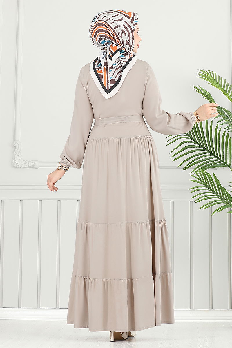 This viscose dress is a modest wear model that can be comfortably used in all seasons. It should be hand washed and offers a light feel with its lining-free design. The half-mandarin collar and button-front design add an elegant touch. The included belt can be worn optionally. The elastic cuffs provide a comfortable fit, while the stylish wavy belt catches the eye. The sample shown is a size 38. An ideal choice for both comfort and elegance!