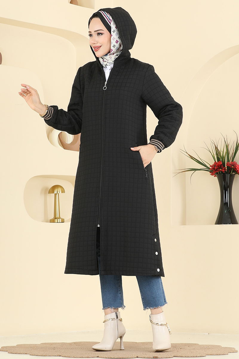 Manşeti Ribana Detaylı Kap, şık ve modern bir tasarıma sahip olan tesettür giyim ürünüdür. Sonbahar ve Kış mevsimlerinde rahatlıkla kullanabilirsiniz. 30 derecede hassas yıkama programında yıkanması önerilir. Kapşonlu yaka tasarımı, yırtmaçlı ve çıtçıtlı açılabilen detayları ile pratik bir kullanım sunar. Astarsız yapısı ve fermuarlı cebi ile hem şık hem de fonksiyonel bir deneyim sağlar. Ürün 38 beden üzerinde gösterilmektedir.
