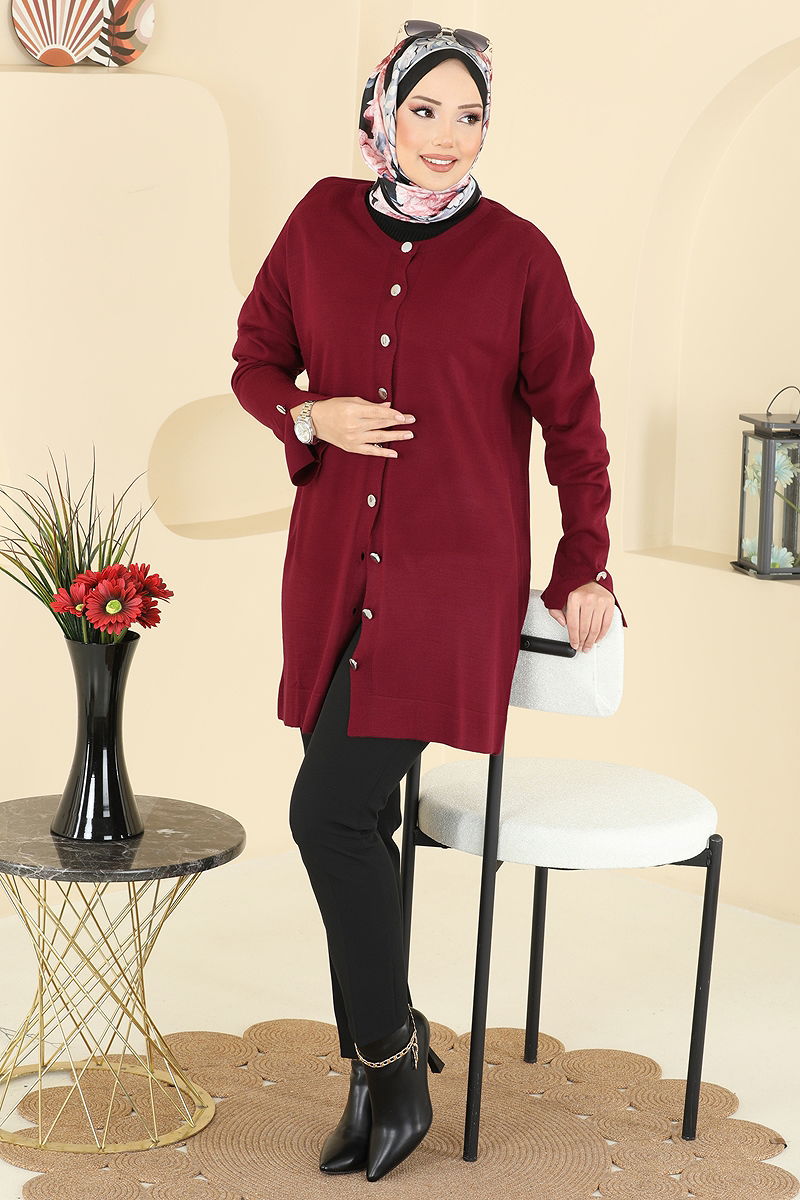 Manşeti Yırtmaçlı Triko Hırka Bordo
