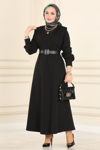 Deri Kemerli Kışlık Elbise PL9036 Siyah