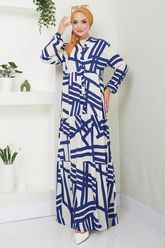 Beli Bağcıklı Desenli Elbise 1137BGS895-M Petrol
