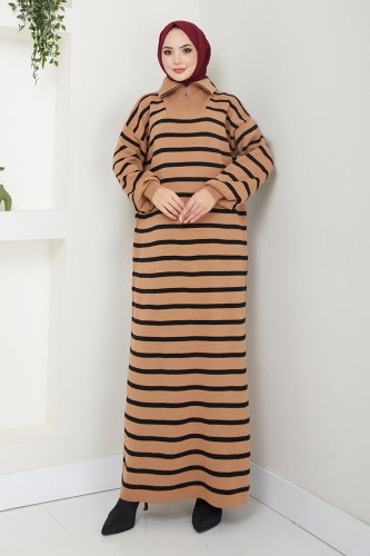 Çizgili Triko Elbise 6025KL1035-M Latte