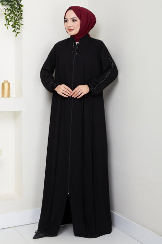 Şerit Detaylı Tesettür Ferace 1007ESL1097-M Siyah