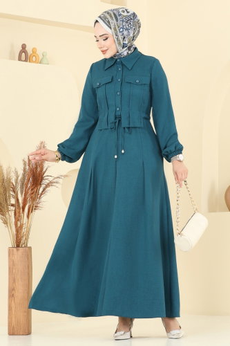 Yazı Baskılı Tesettür Elbise 4108PM271 Koyu Laci