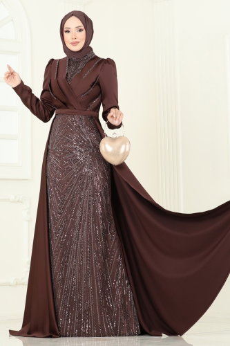 SUAL Boncuk Detaylı Saten Abiye 5234D170 Kahve