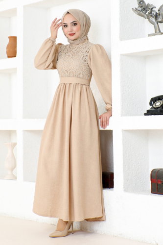 Dantel İşlemeli Elbise HBS2407-M Bej