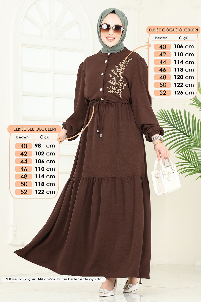 Nakış Detaylı Aerobin Elbise, özellikle tesettür giyim tarzını benimseyen bayanlar için ideal bir seçimdir. Dört mevsim boyunca rahatlıkla kullanılabilir olan bu elbise, hassas yıkama programında 30 derecede yıkanabilir. Aerobin kumaş sayesinde hafif ve nefes alabilen bir yapıya sahiptir. Yarım hakim yaka ve ön kısımda yarım düğme detayları ile şıklık sunar. Astarsız tasarımı ve manşetleri lastikli ve bağlamalı yapıları ile konforlu bir kullanım sağlar. Nakış detayları ile göz alıcı bir görünüm kazanır. Model 38 beden ölçülerinde olup, boyu 165 cm, göğüs ölçüsü 88 cm, bel ölçüsü 68 cm, basen ölçüsü 99 cm ve 56 kg ağırlığındadır.