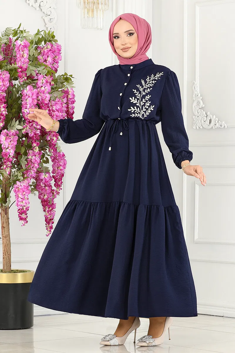 Nakış Detaylı Aerobin Elbise, özellikle tesettür giyim tarzını benimseyen bayanlar için ideal bir seçimdir. Dört mevsim boyunca rahatlıkla kullanılabilir olan bu elbise, hassas yıkama programında 30 derecede yıkanabilir. Aerobin kumaş sayesinde hafif ve nefes alabilen bir yapıya sahiptir. Yarım hakim yaka ve ön kısımda yarım düğme detayları ile şıklık sunar. Astarsız tasarımı ve manşetleri lastikli ve bağlamalı yapıları ile konforlu bir kullanım sağlar. Nakış detayları ile göz alıcı bir görünüm kazanır. Model 38 beden ölçülerinde olup, boyu 165 cm, göğüs ölçüsü 88 cm, bel ölçüsü 68 cm, basen ölçüsü 99 cm ve 56 kg ağırlığındadır.