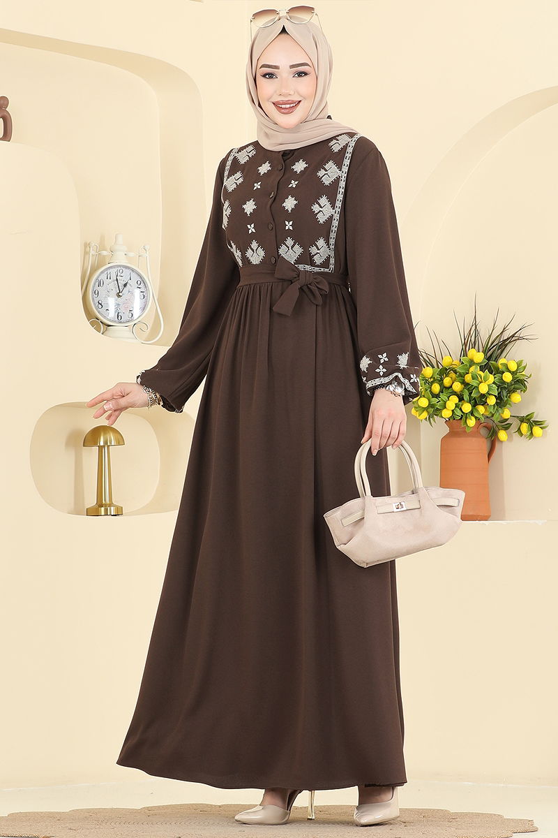 Nakış Detaylı İthal Krep Elbise, zarif tasarımı ile dört mevsim kullanılabilecek özel bir tesettür elbisesidir. Yumuşak krep kumaşı, hassas yıkama ile 30 derecede yıkanabilir olup pratik kullanım sunar. İthal krep kumaşı tercih edilmiş ve hakim yaka detayı ile şıklık katılmıştır. Yarı düğmeli ön kısıma sahip bu elbise, astarsız olarak tasarlanmış ve rahat bir kullanım sağlar. Model, nakış detayları ile süslenmiş olup dikişli beli ve manşet lastiği ile konforunu artırır. Kemer ürüne dahil olup, isteğe bağlı çıkarılabilir. Ürün boyu 165 cm, göğüs 80 cm, bel 68 cm, basen 96 cm ölçülerindedir. Kemerin uçları dikilmiş, dalgalanmayı önlemek amacıyla orta kısım dikişsiz bırakılmıştır.