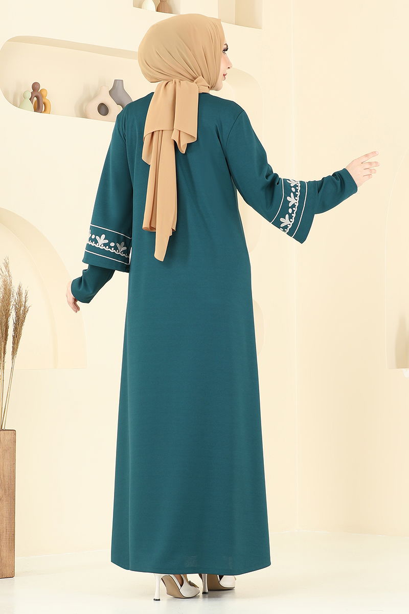 Nakış İşlemeli Pardesü Ferace Petrol