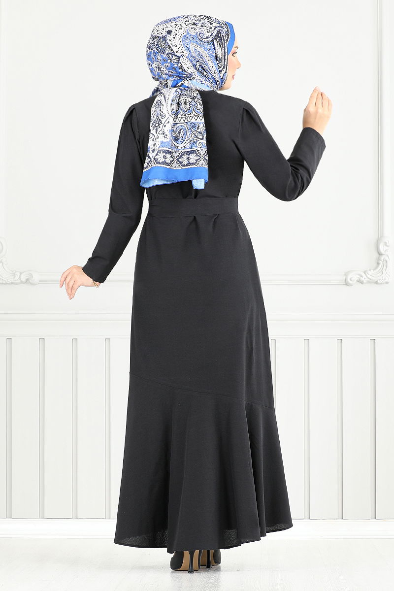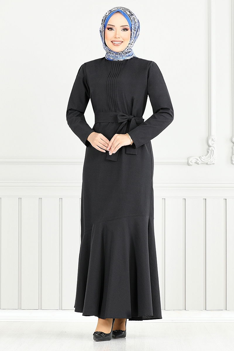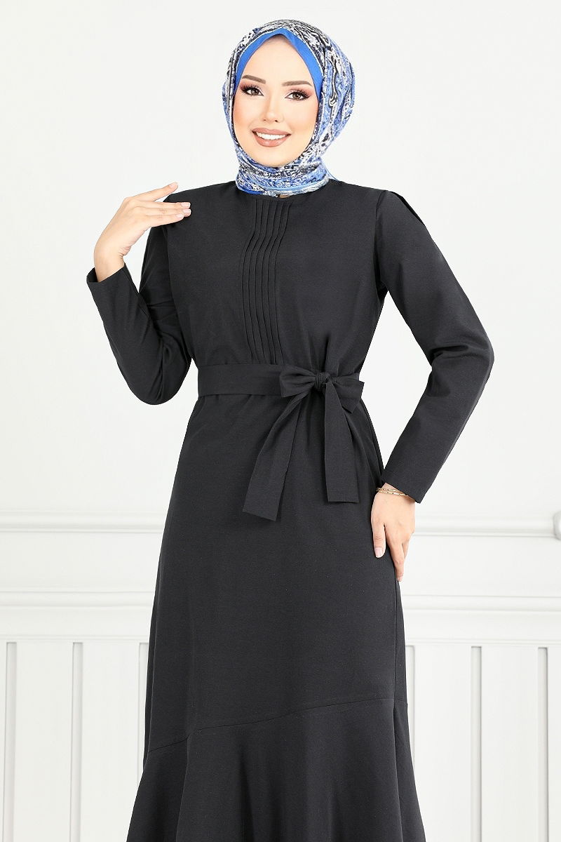 Nervür Detay Tesettür Elbise Siyah