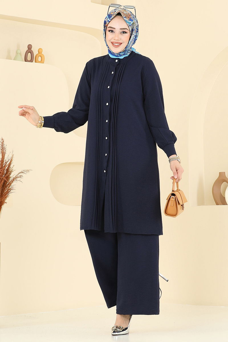The Detail Hijab Suit is a combination model made from aerobin fabric, suitable for use across all seasons. This garment can be washed at 30 degrees on a gentle cycle. It features a semi-mandarin collar and button details at the front, offering a lightweight and comfortable wear with its lining-free design. The showcased size 38 sample includes elastic details at the waistband of the pants. The active buttons on the cuffs of the tunic and pants add an extra touch of elegance.
