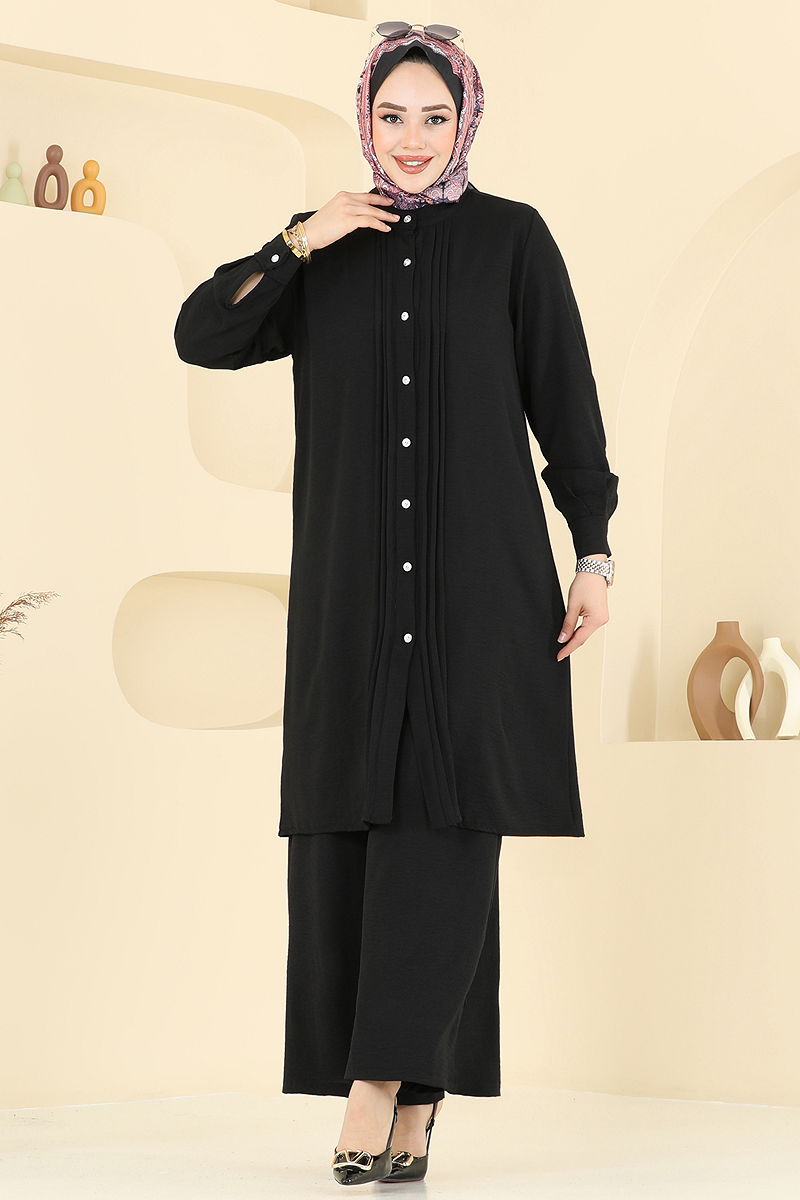 Nervür Detay Tesettür Takım, aerobin kumaştan üretilmiş, dört mevsim rahatlıkla kullanabileceğiniz bir kombin modelidir. Hassas yıkamaya uygun bu ürün 30 derecede yıkanabilir. Tasarımında ön planda yarım hakim yaka ve düğme detayları bulunmaktadır. Astarsız yapısı ile hafif ve konforlu bir kullanım sunar. Modelin üzerindeki 38 beden örneği ile pantolonun bel kısmında elastik detaylar bulunmaktadır. Tunik ve pantolon manşetlerindeki aktif düğmeler ise şıklığına şıklık katar.