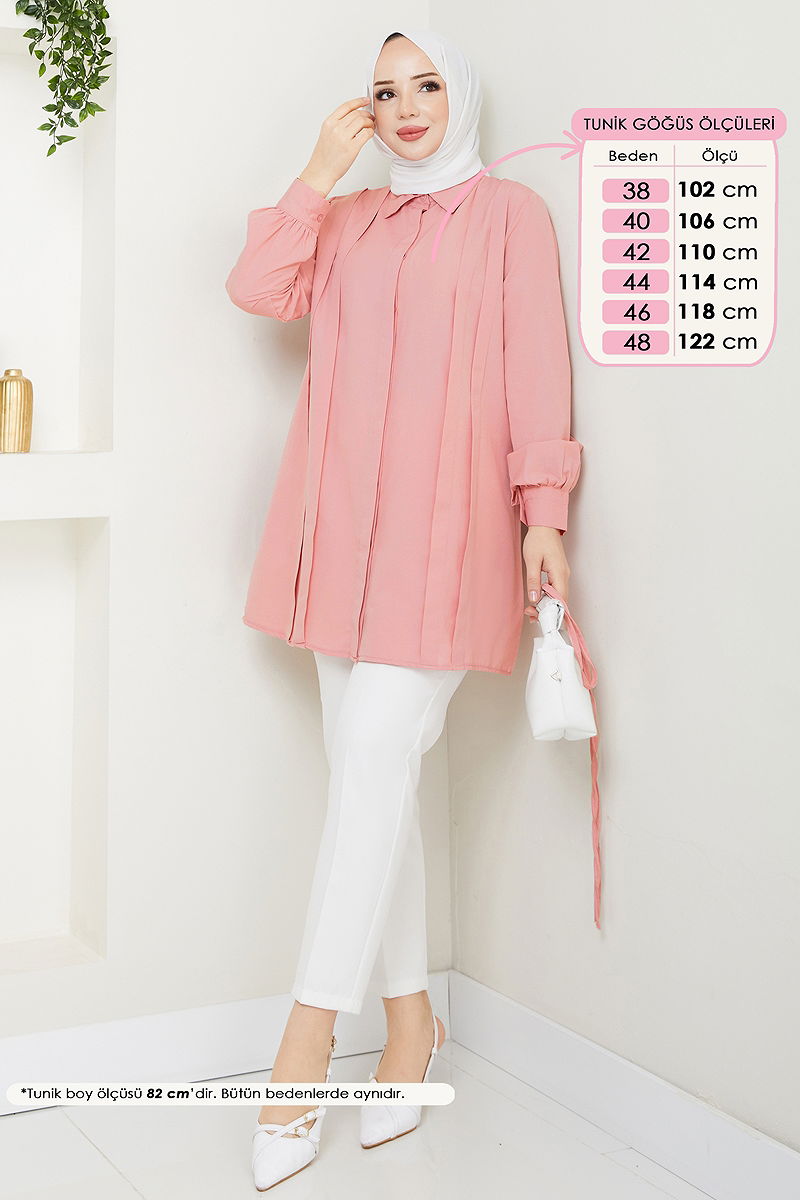 Nervür Detay Tesettür Tunik, dört mevsim boyunca rahatlıkla kullanabileceğiniz bir üründür. Özel 30 derecede hassas yıkama programında yıkanabilen bu tunik, dayanıklı poplin kumaştan üretilmiştir. Gömlek yaka ve gizli düğmeleri ile şık bir görünüm sunar. Manşetlerde yer alan aktif düğmeler fonksiyonel bir kullanım sağlar. Astarsız oluşu ile hafif ve rahattır. Ürüne dahil olan kemer, iki ucu dikilmiş şekilde tasarlanmış olup, orta kısım dikişsizdir. Kemer isteğe bağlı olarak kullanılabilir. Bu ürün 38 beden örneği ile sergilenmektedir.