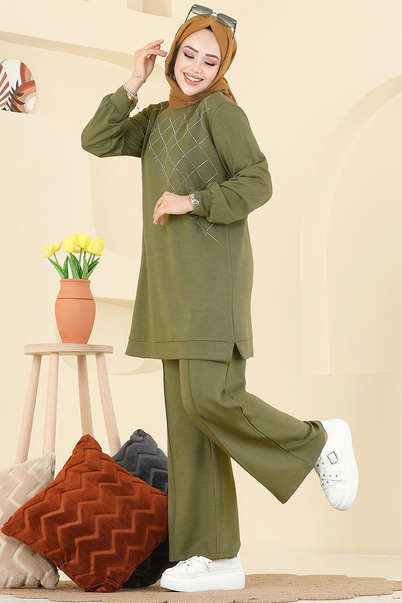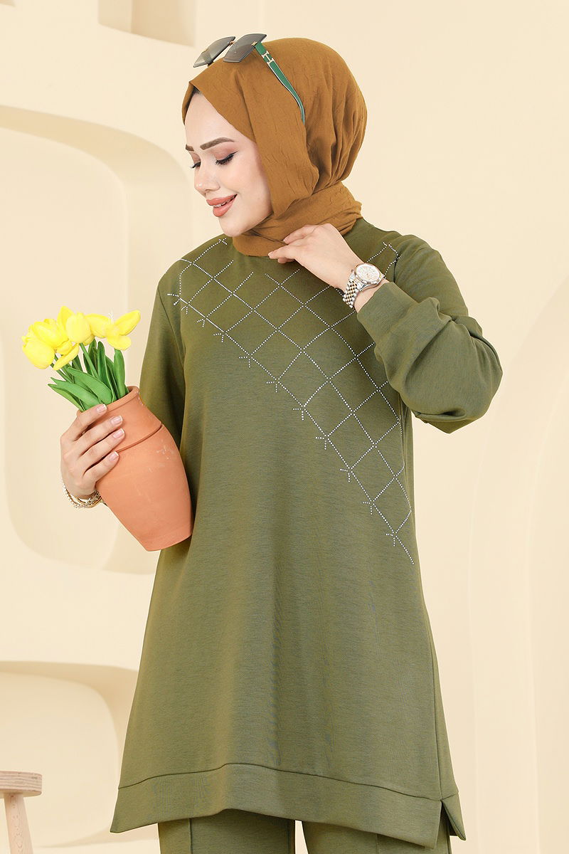 Ürün Özelliği : Yeni sezon tesettür moda ürünüdür. Ürün Bisiklet yakadır. Astarsızdır. Taşlar yapıştırmadır. Pantolon beli lastiklidir. Konsept fotoğraf çekimlerinden dolayı üründe ton farklılığı olabilir.
