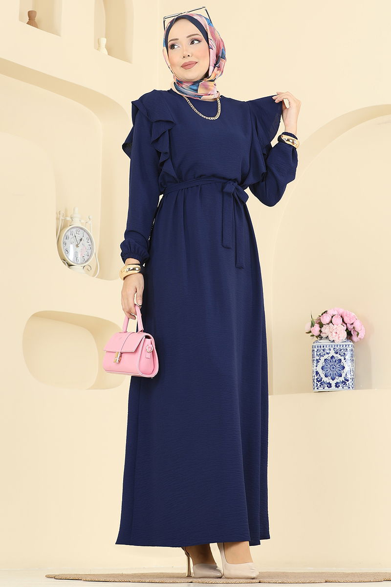 The Ruffled Shoulder Aerobin Dress is a modern and stylish hijab dress suitable for all seasons. It can be washed on a gentle cycle at 30 degrees and features a crew neck without lining for comfort. Displayed on a size 38 model, it includes a practical button at the back. The belt is designed with sewn ends to prevent waving and can be optionally removed. With elasticated cuffs, this dress is ideal for maintaining your elegance in any setting.