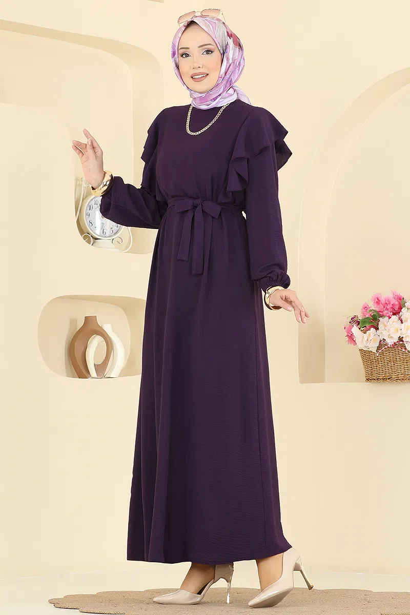 Omuz Fırfırlı Aerobin Elbise, dört mevsim rahatlıkla tercih edebileceğiniz, modern ve şık bir tesettür elbisedir. 30 derecede hassas yıkama programında yıkanabilen bu elbise, bisiklet yakası ve astarsız tasarımıyla konfor sunar. Ürün 38 beden olarak model üzerinde gösterilmekte ve sırt kısmında kullanılan düğme ile pratik bir kullanım sağlar. Kemer, iki ucunun dikilmesiyle dalgalanmayı önler ve isteğe bağlı olarak çıkarılabilir. Manşetleri lastikli olan bu elbise, her ortamda şıklığınızı korumanız için idealdir.