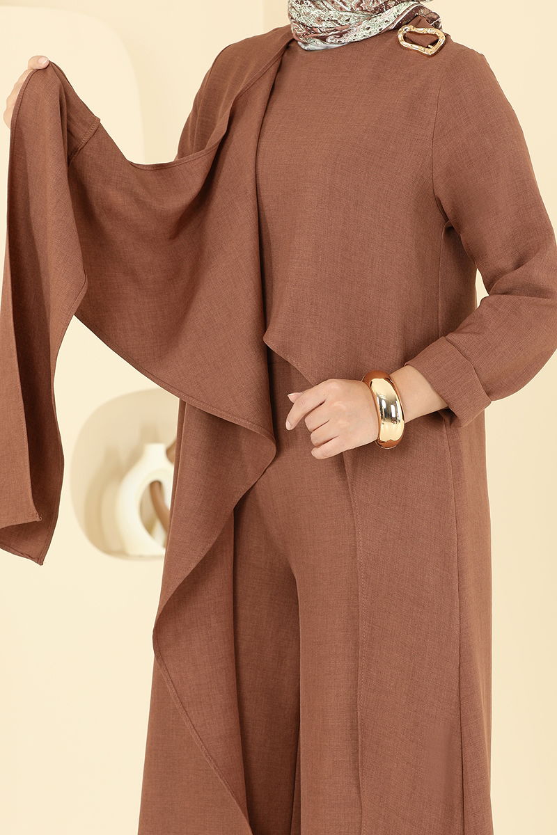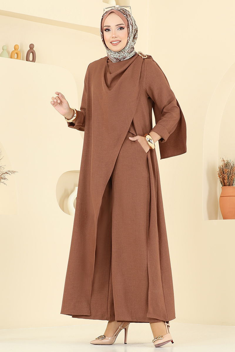 Sofia Keten Omuz Tokalı Takım, tesettür modasına şık bir soluk getiriyor. Dört mevsim rahatlıkla kullanabileceğiniz bu model, 30 derecede hassas yıkamaya uygundur. Bisiklet yakası ve sırttan fermuar detayı ile modern bir duruş sergileyen tunik, ön yırtmaçlı ve astarsız tasarımıyla konforu ön planda tutuyor. Pantolon ise beli lastikli olarak tasarlanmıştır, hem şık hem de rahat bir kullanım sunar. Sofia keten kumaşı, hem dayanıklılığı hem de zarif görünümü ile dört dörtlük bir tercih.