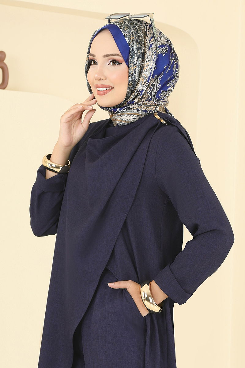 The Sofia Canvas Shoulder Buckled Set brings a stylish breeze to modest fashion. Suitable for all seasons and delicate washing at 30 degrees, this ensemble ensures comfort. It features a bicycle collar and a zipper at the back for a contemporary posture. The tunic is designed with a front slit and without lining for maximum comfort. The trousers are designed with an elastic waist, offering both style and comfort. Sofia canvas fabric offers durability and an elegant appearance, making it a perfect choice.