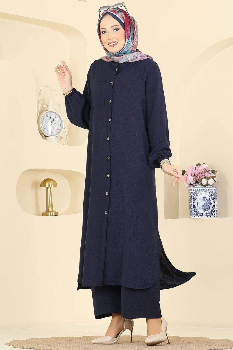 Göğüs Cep Detaylı Tesettür Kombin, her mevsim rahatlıkla kullanabileceğiniz aerobin kumaştan üretilmiştir. Hassas yıkama ile 30 derecede yıkanabilen bu ürün, yarım hakim yaka ve ön düğmeli tasarımı ile şıklığı pratiklikle buluşturur. Tunik yan yırtmaç detaylı ve astarsızdır. Pantolonun beli lastikli ve manşetleri lastiklidir. Tunikte bulunan aktif göğüs cebi ise fonksiyonelliği artırır. Bu zarif tesettür kombin, rahatlığı ve şıklığı bir arada sunarak tüm gözleri üzerinize çeker. (Modelin üzerindeki ürün 40 bedendir.)