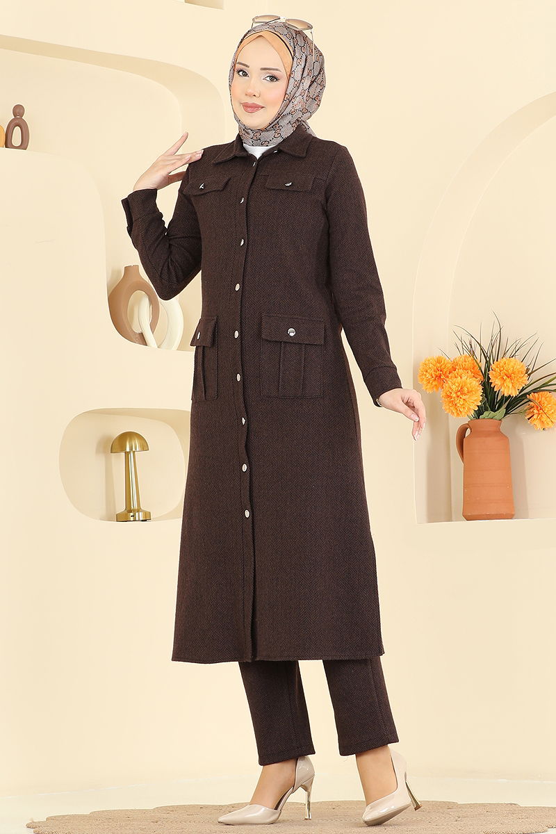 Önden Düğmeli Balıksırtı Takım 24022UKB139 Kahve