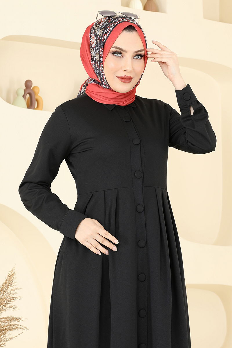 Şık ve pratik tasarımı ile dikkat çeken Önden Düğmeli Elbise Ferace , Ön etek kısmında pilise mevcuttur. Dört mevsim rahatlıkla kullanabileceğiniz ideal bir tesettür ürünüdür. Hassas yapısıyla 30 derecede yıkanabilen bu ferace, krep kumaşı sayesinde uzun ömürlü kullanım vaat eder. Gömlek yaka ve ön düğmeli tasarımı ile modern bir görünüm sunarken, manşet düğmeleri aktif kullanım imkanı sağlar. Astarsız yapısı ve yanlarda bulunan cepler ise fonksiyonellik katmaktadır. Ürün 38 beden olarak model üzerinde sergilenmiştir.