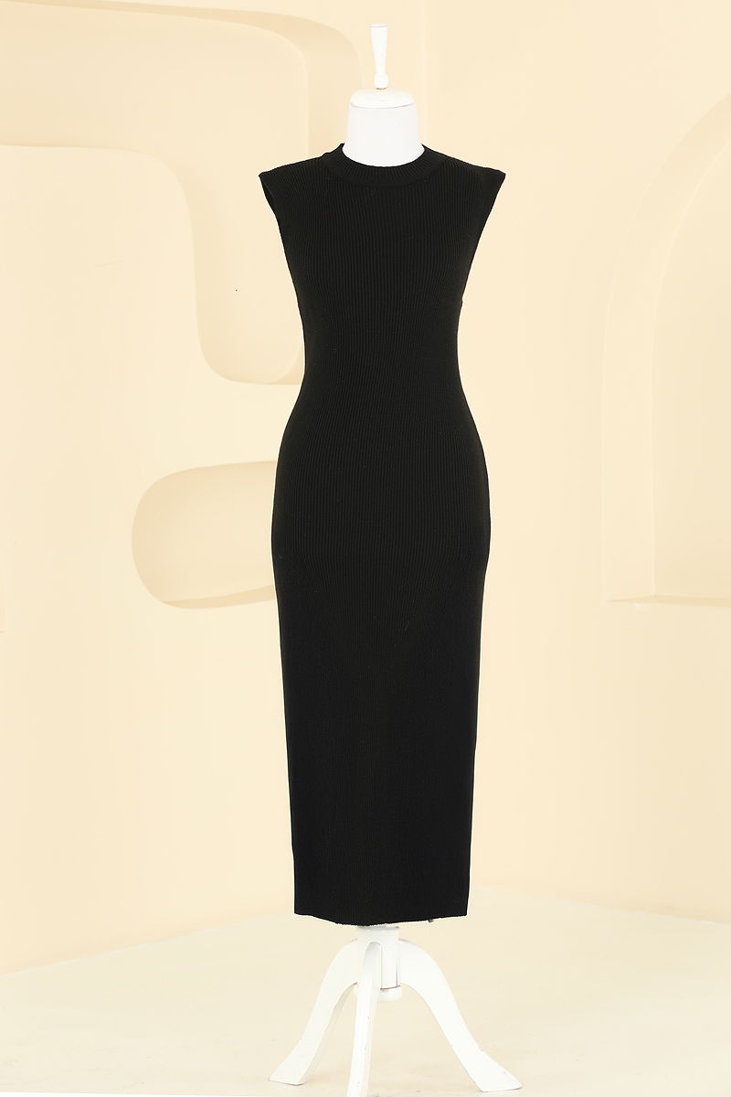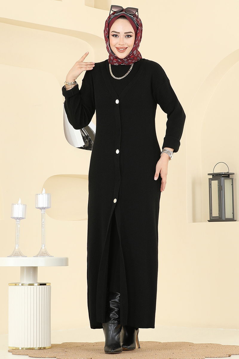 Önden Düğmeli Elbiseli Triko Takım Siyah