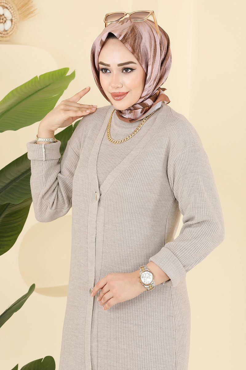 Önden Düğmeli Elbiseli Triko Takım Taş