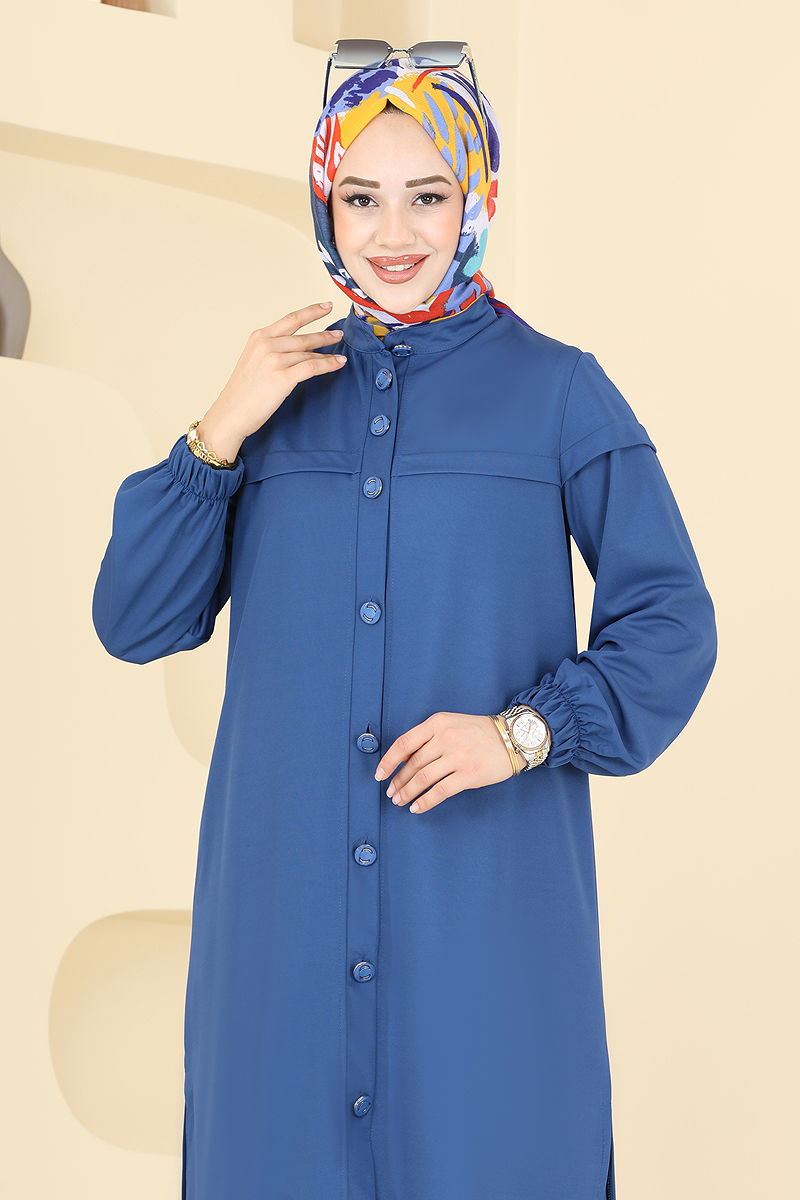 Önden Düğmeli İkili Takım , dört mevsim rahatlıkla kullanabileceğiniz tesettür bir üründür. Hassas kıyafetler için önerilen 30 derecede yıkama özelliği ile pratik ve uzun ömürlü kullanım sunar. Yumuşak dokusu ve kaliteli örme Dabıl kumaşı ile konforlu bir deneyim yaşatır. Yarım Hakim yaka ve önden düğmeli tasarımı şık bir görünüm sağlarken, yandan yırtmaçlı tunik tasarımı hareket özgürlüğü sunar. Pantolonun lastikli beli ise maksimum rahatlık sağlar. Bu zarif ikili; kap ve pantolon olmak üzere tam bir stil sahibi olmanıza olanak tanır.