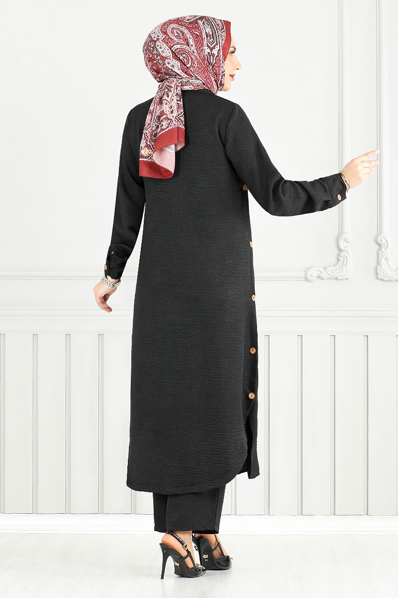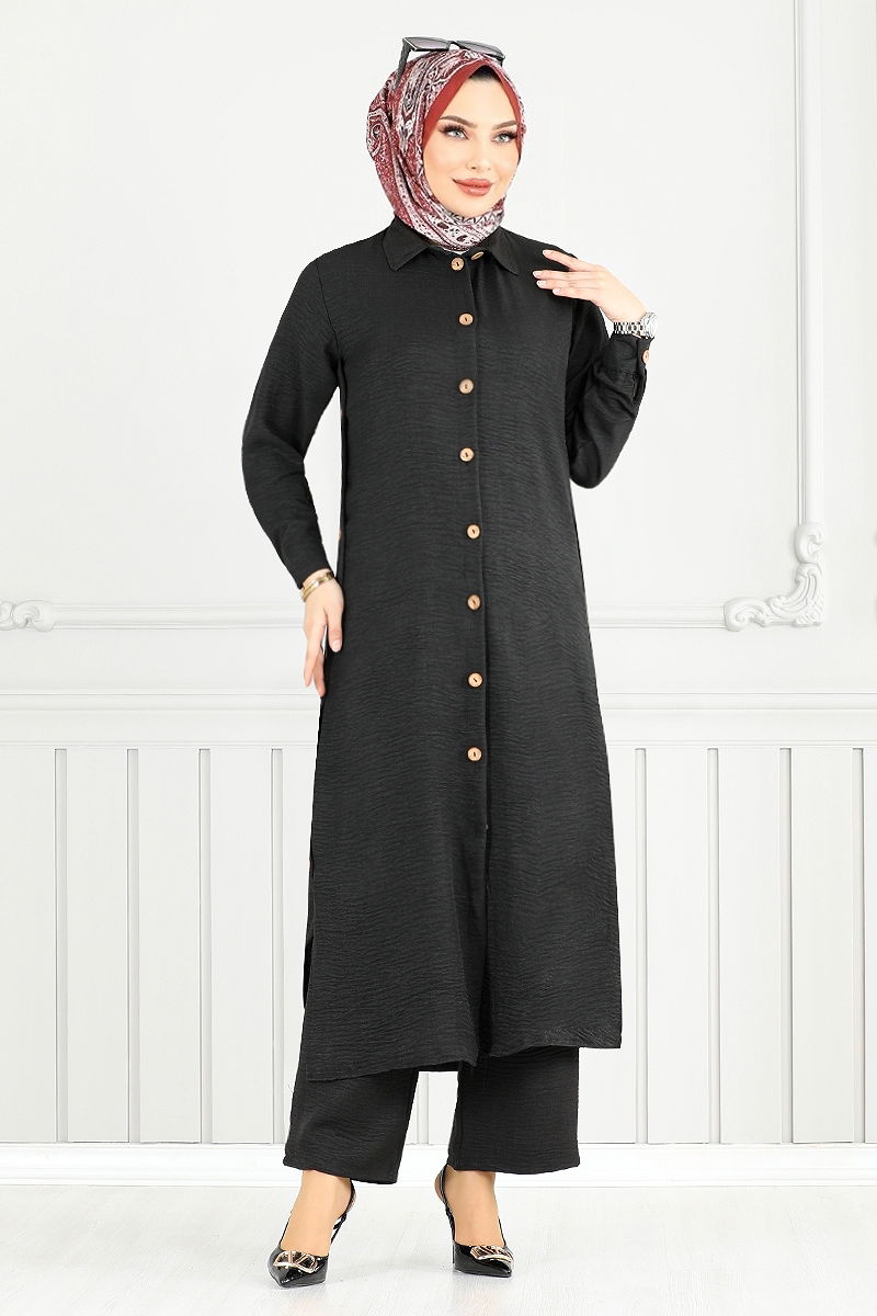Önden Düğmeli Keten Takım 833OZR1047-M Siyah
