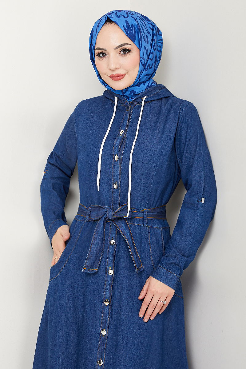 Önden Düğmeli Kot Elbise, dört mevsim rahatlıkla kullanabileceğiniz bir tesettür ürünüdür. Hassas yapıda olan bu elbise, 30 derecede yıkanabilir özelliğe sahiptir. Tensel ve kot kumaştan üretilmiş olan bu model, kapşonlu yakaya sahip olup, ön taraftan düğmeli bir tasarıma sahiptir. Astarsız olan elbise, kapşon ve kemer detayları ile dikkat çeker. Kemer, dalgalanmayı önlemek için iki ucu dikilmiş olup, dilediğinizde çıkarılabilir. Elbisenin manşetleri aktif düğmeler ile tamamlanmıştır ve cepli bir tasarıma sahiptir.