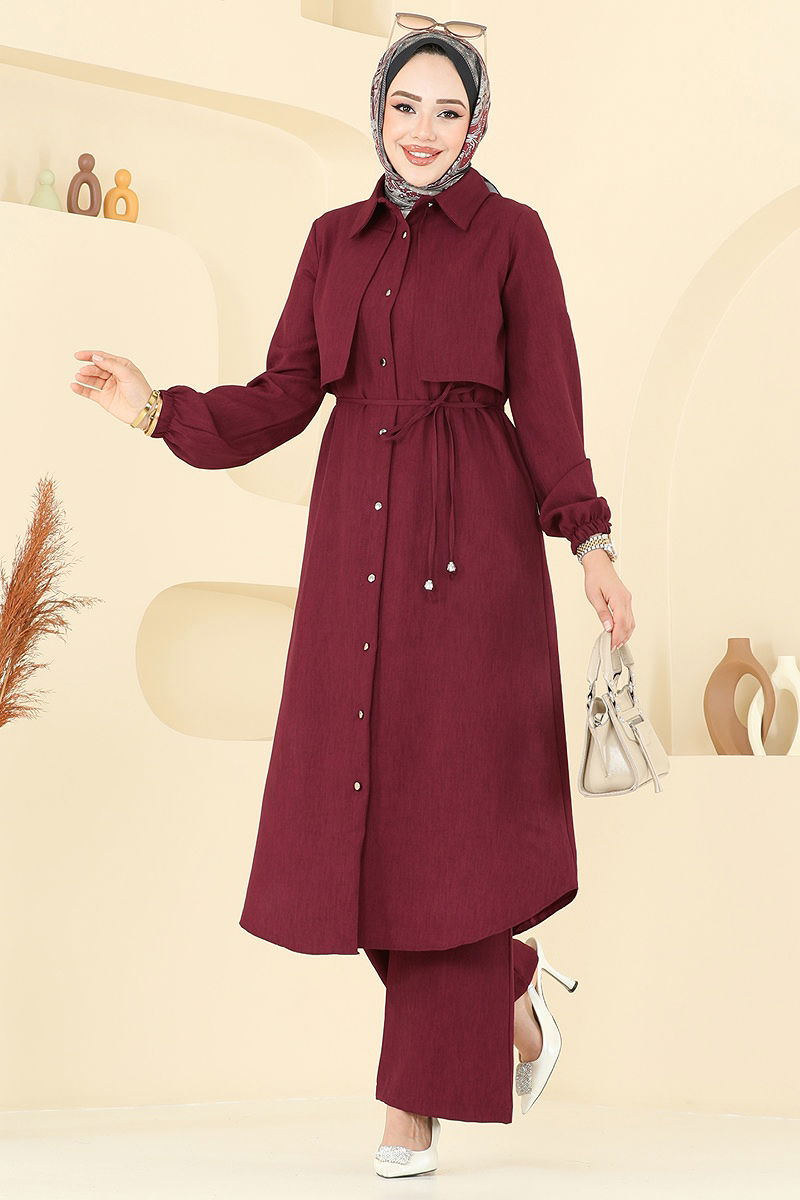Ürün Özelliği : Yeni sezon tesettür moda ürünüdür. Ürün Gömlek yakadır. Ürün Önden düğmelidir. Astarsızdır. Detaylar dikilidir. Kemer ürüne dahildir, isteğe bağlı kullanılmayabilir. Bluz ürüne dahil değildir. Ürün kullanım amacını göstermek için bluz ile örnek kombin yapılmıştır. Pantolon beli lastiklidir. Manşet lastiklidir. Konsept fotoğraf çekimlerinden dolayı üründe ton farklılığı olabilir.