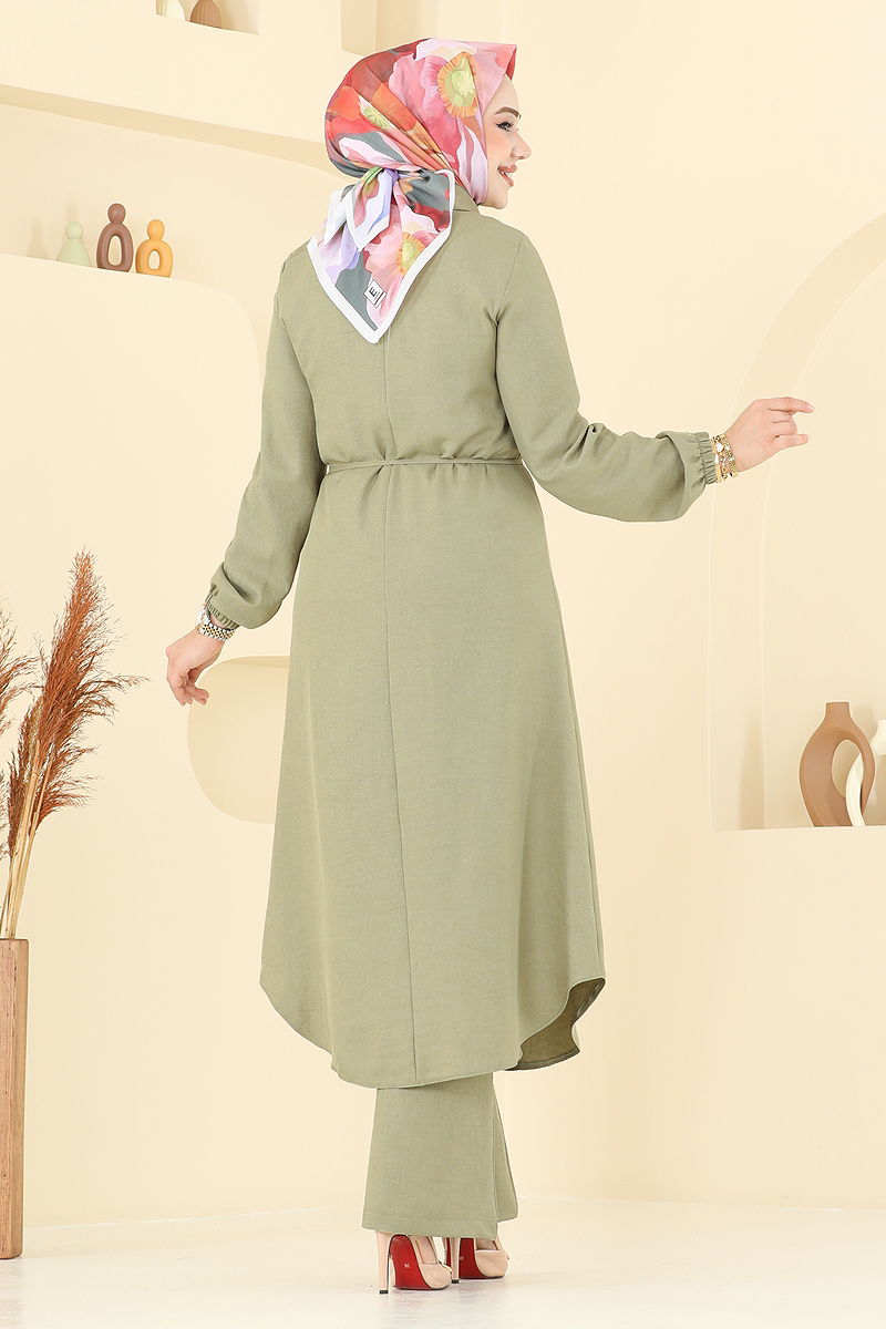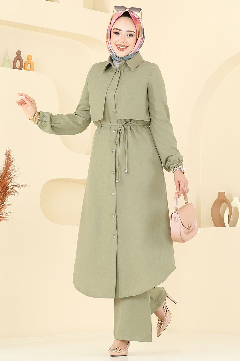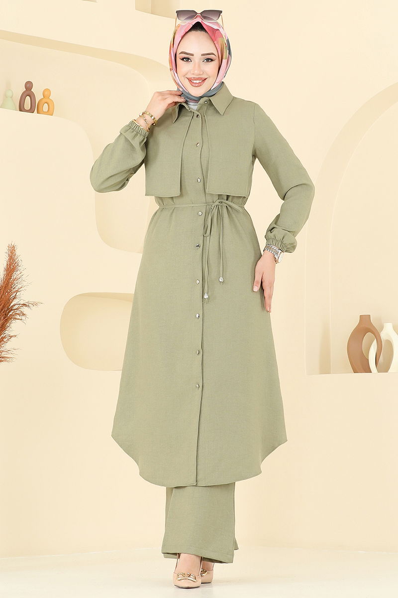 Ürün Özelliği : Yeni sezon tesettür moda ürünüdür. Ürün Gömlek yakadır. Ürün Önden düğmelidir. Astarsızdır. Detaylar dikilidir. Kemer ürüne dahildir, isteğe bağlı kullanılmayabilir. Bluz ürüne dahil değildir. Ürün kullanım amacını göstermek için bluz ile örnek kombin yapılmıştır. Pantolon beli lastiklidir. Manşet lastiklidir. Konsept fotoğraf çekimlerinden dolayı üründe ton farklılığı olabilir.