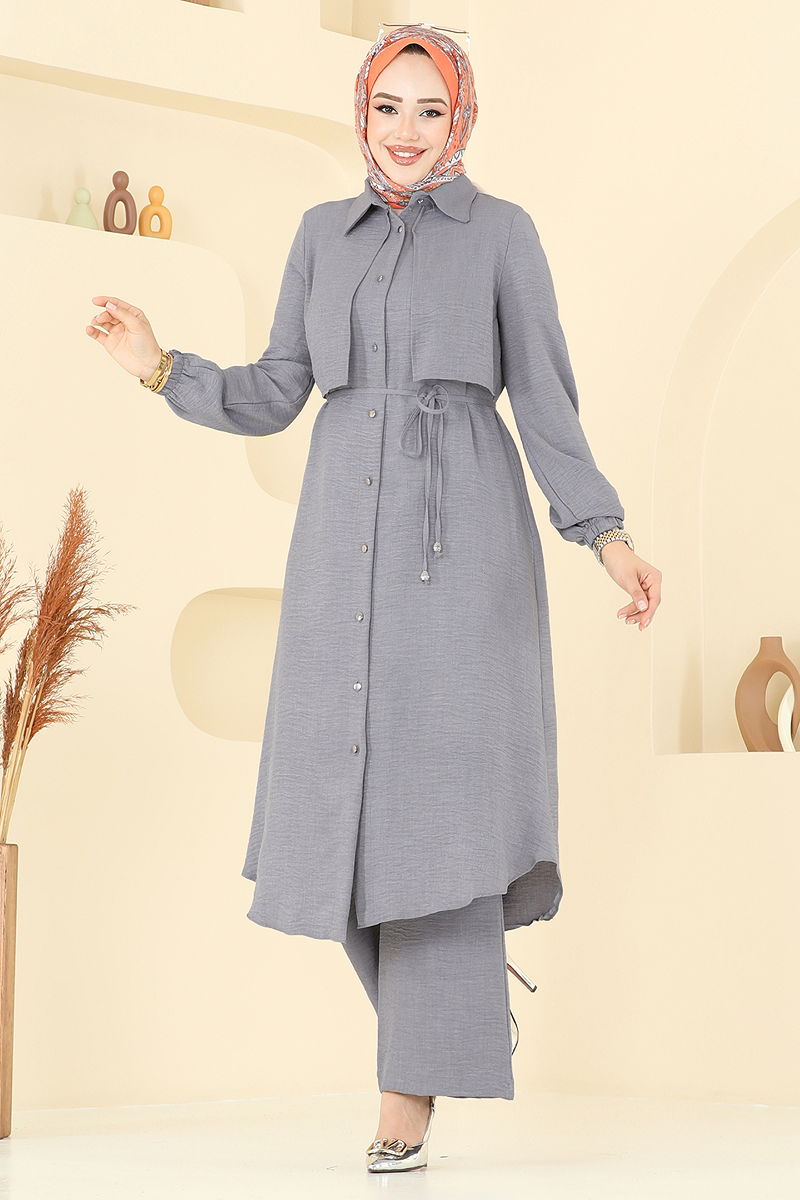Ürün Özelliği : Yeni sezon tesettür moda ürünüdür. Ürün Gömlek yakadır. Ürün Önden düğmelidir. Astarsızdır. Detaylar dikilidir. Kemer ürüne dahildir, isteğe bağlı kullanılmayabilir. Bluz ürüne dahil değildir. Ürün kullanım amacını göstermek için bluz ile örnek kombin yapılmıştır. Pantolon beli lastiklidir. Manşet lastiklidir. Konsept fotoğraf çekimlerinden dolayı üründe ton farklılığı olabilir.