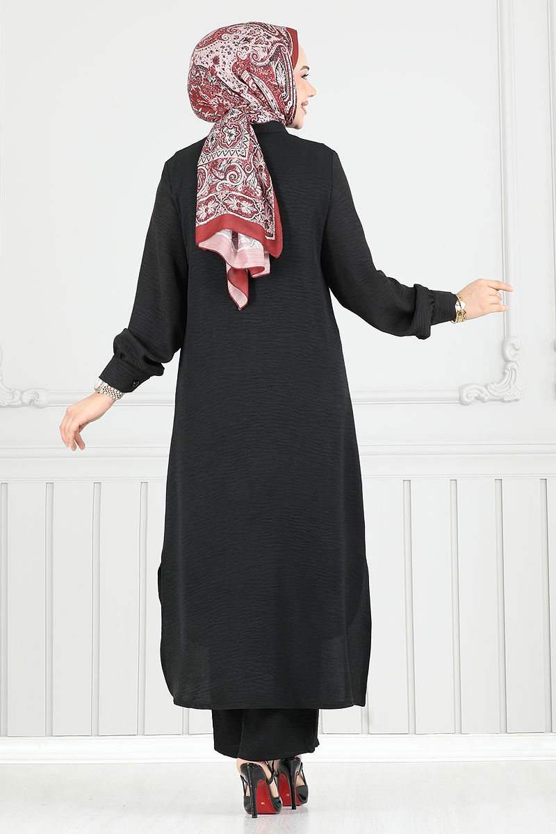 Önü Düğmeli Sofia Takım ile şıklığınıza şıklık katın! Hem modern hem de tesettür tarzını benimseyenler için özel olarak tasarlanmış bu takım, dört mevsim boyunca rahatlıkla kullanılabilir. Keten kumaşın hafifliği ve pantolonun elastik beli, gün boyu konfor sağlarken, tuniğin yandan yırtmaçlı ve manşet düğmeli oluşu ise stilinize modern bir dokunuş ekler. 30 derecede hassas yıkama ile kolayca temizlenebilir. Sofia Takım, her ortamda zarif ve rahat hissetmenizi sağlar.
