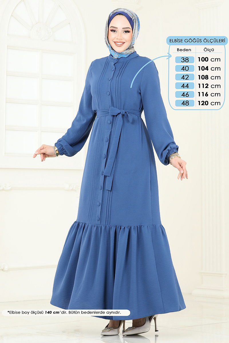The Front-Buttoned Hijab Dress is suitable for all seasons. Made from Aerobin fabric, this dress can be washed at 30 degrees on a gentle cycle. It features a half mandarin collar and buttoned front, providing a lightweight and comfortable wear as it is unlined. The included belt has both ends stitched while the middle part is left without stitching, offering a smoother appearance. The belt is optional. Elastic cuffs ensure ease of wear. The product model shown is in size 38.