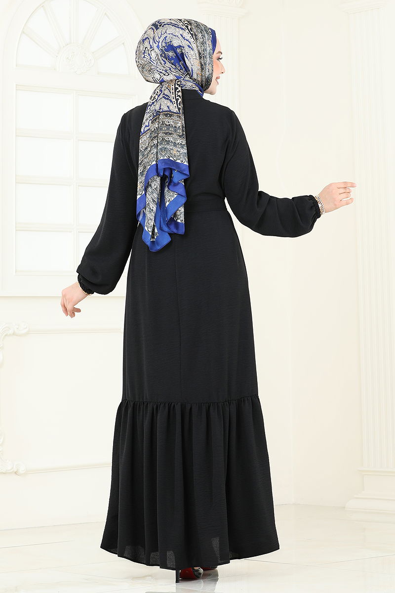 The Front-Buttoned Hijab Dress is suitable for all seasons. Made from Aerobin fabric, this dress can be washed at 30 degrees on a gentle cycle. It features a half mandarin collar and buttoned front, providing a lightweight and comfortable wear as it is unlined. The included belt has both ends stitched while the middle part is left without stitching, offering a smoother appearance. The belt is optional. Elastic cuffs ensure ease of wear. The product model shown is in size 38.