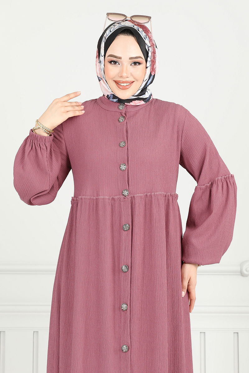 Önden Düğmeli Tesettür Elbise Koyu Gül Kurusu