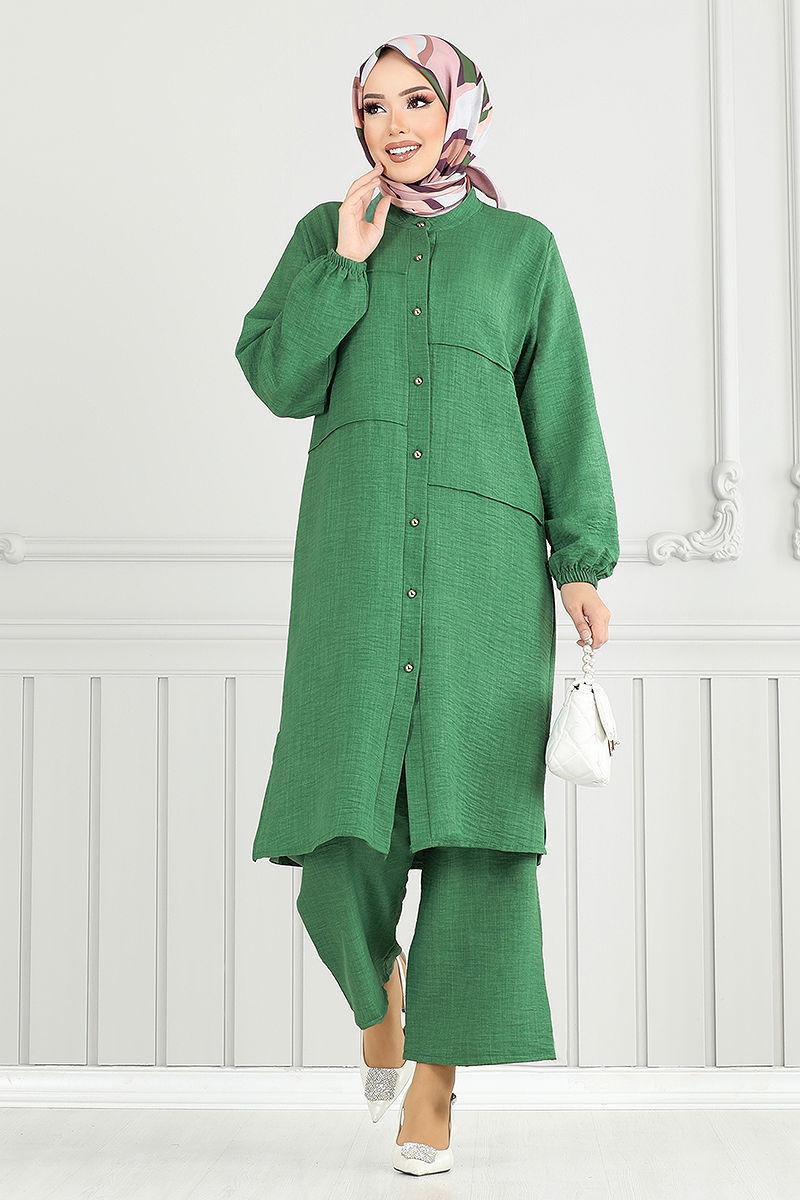 Önden Düğmeli Tesettür Takım, Sofia Keten kumaştan üretilmiş olup dört mevsim rahatlıkla kullanılabilir. 30 derecede hassas yıkama ile temizlenmesi önerilen bu şık takım, yarım hakim yaka ve ön düğmeli tasarımıyla dikkat çeker. Tunik yanlarda yırtmaç detayına sahipken, pantolon beli ve manşetleri lastiklidir. Hem günlük hem de özel günlerinizde tercih edebileceğiniz bu takım, rahatlığı ve şıklığı bir arada sunar.
