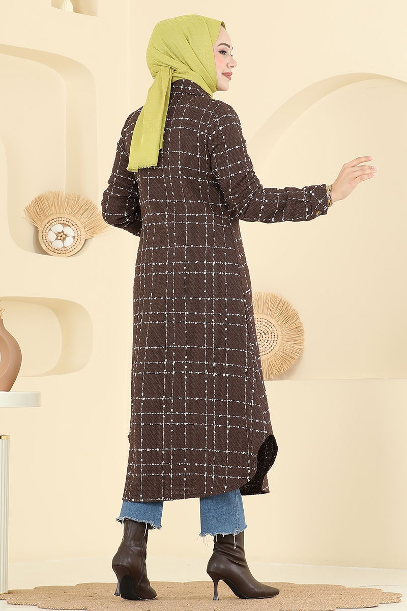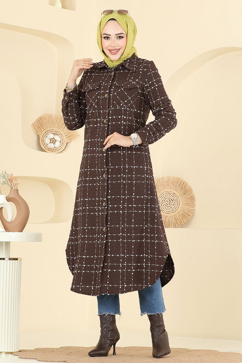 Önden Düğmeli Tüvit Tunik, sonbahar ve kış sezonu için ideal bir tesettür ürünüdür. Hassas yıkama ile 30 derecede yıkanabilen bu tunik, dayanıklı tüvit kumaştan üretilmiştir. Gömlek yaka ve önden düğmeli tasarımıyla şık bir görünüm sunar. Ürün 38 beden üzerindeki model ile fit bir duruş sergiler. Göğüs cep ve manşetsiz düğmeleri ise hem pratik hem de estetik bir detay katmaktadır.