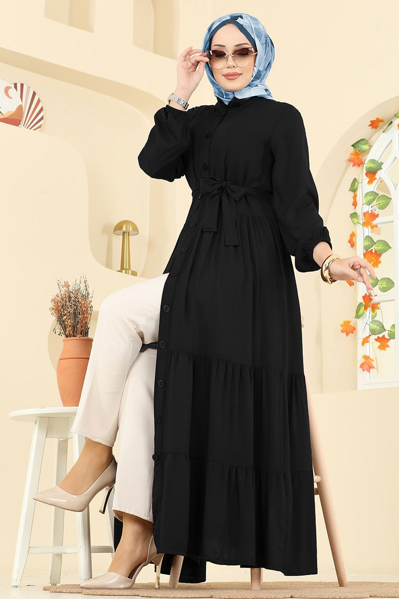 Önden Düğmeli Viskon Elbise Siyah