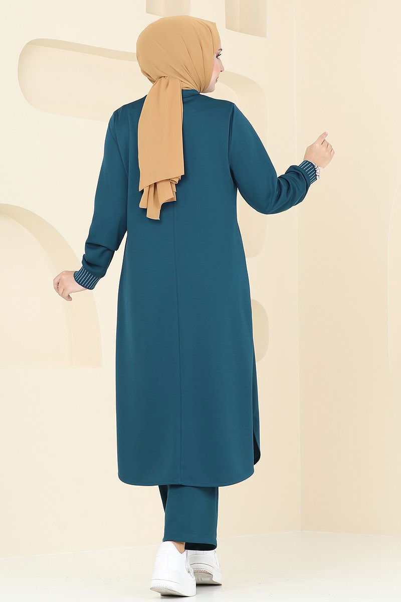 Önden Fermuarlı Garnili Takım model tesettür ürünüdür. Sonbahar ve Kış sezonunda kullanılabilir. 30 DERECEDE SIKTIRILMADAN YIKANABİLİR. (HASSAS YIKAMA) Örme Dabıl kumaştan imal edilmiştir. Ürün Yarım Hakim yakadır. Astarsızdır. Ürün Önden fermuarlıdır. (Modelin üzerindeki ürün 40 bedendir.) Boy: 165 cm, Göğüs: 80 cm, Bel: 68 cm, Basen: 96 cm, Kilo: 54 kg. Pantolon beli lastiklidir. Cep mevcuttur.