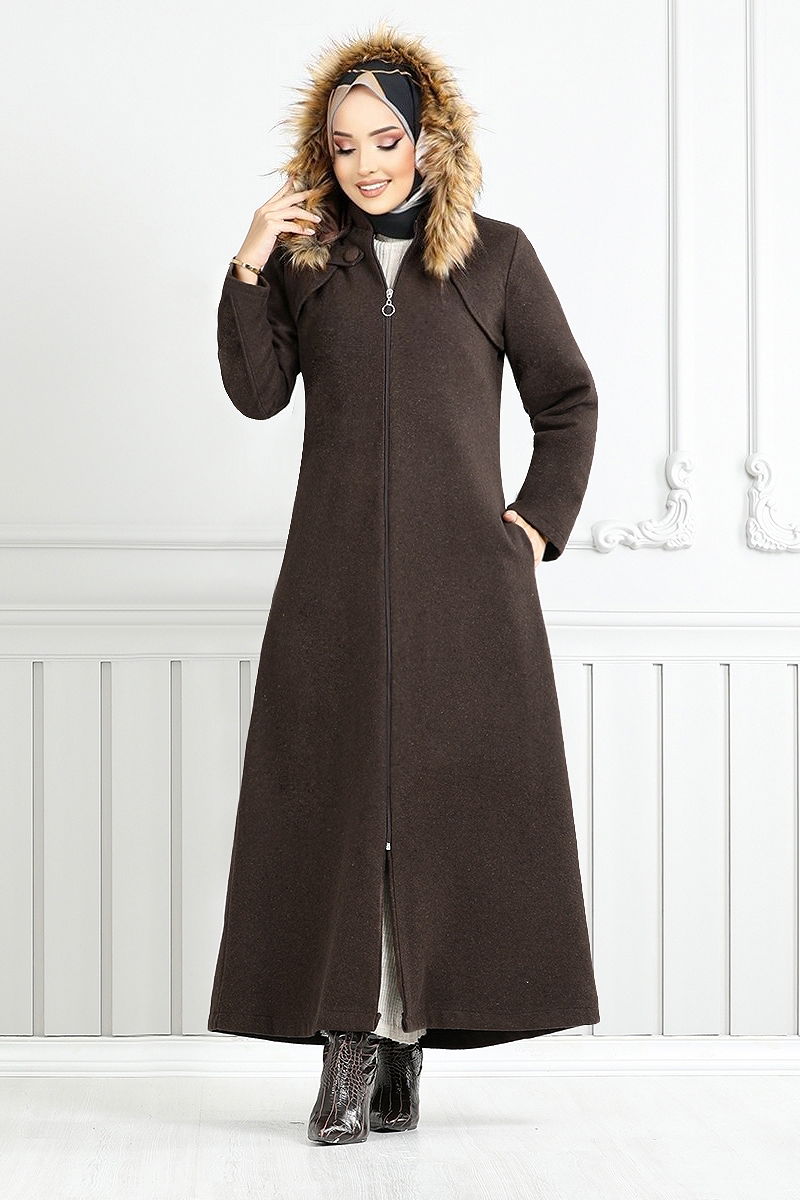 Önden Fermuarlı Kaşe Kaban 2058BGS895-M Kahve