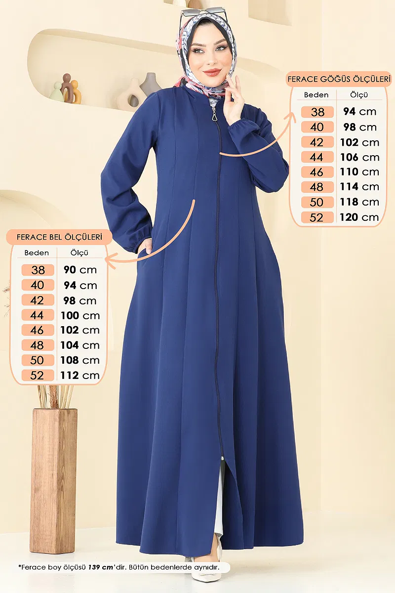 Önden Fermuarlı Pardesü Ferace, dört mevsim rahatlıkla kullanabileceğiniz, dabıl kumaştan üretilmiş şık bir tesettür giysisidir. Hassas 30 derecede yıkanabilir özelliği ile bakımı kolaydır. Yarım hakim yaka tasarımına sahip olan bu model, astarsızdır ve ön tarafında kullanışlı bir fermuara sahiptir. Ayrıca pratik kullanım için cepli bir tasarıma sahiptir. Modelin üzerindeki 38 beden, 167 cm boy, 90 cm göğüs, 70 cm bel, 100 cm basen ölçülerine ve 59 kg ağırlığa sahiptir.