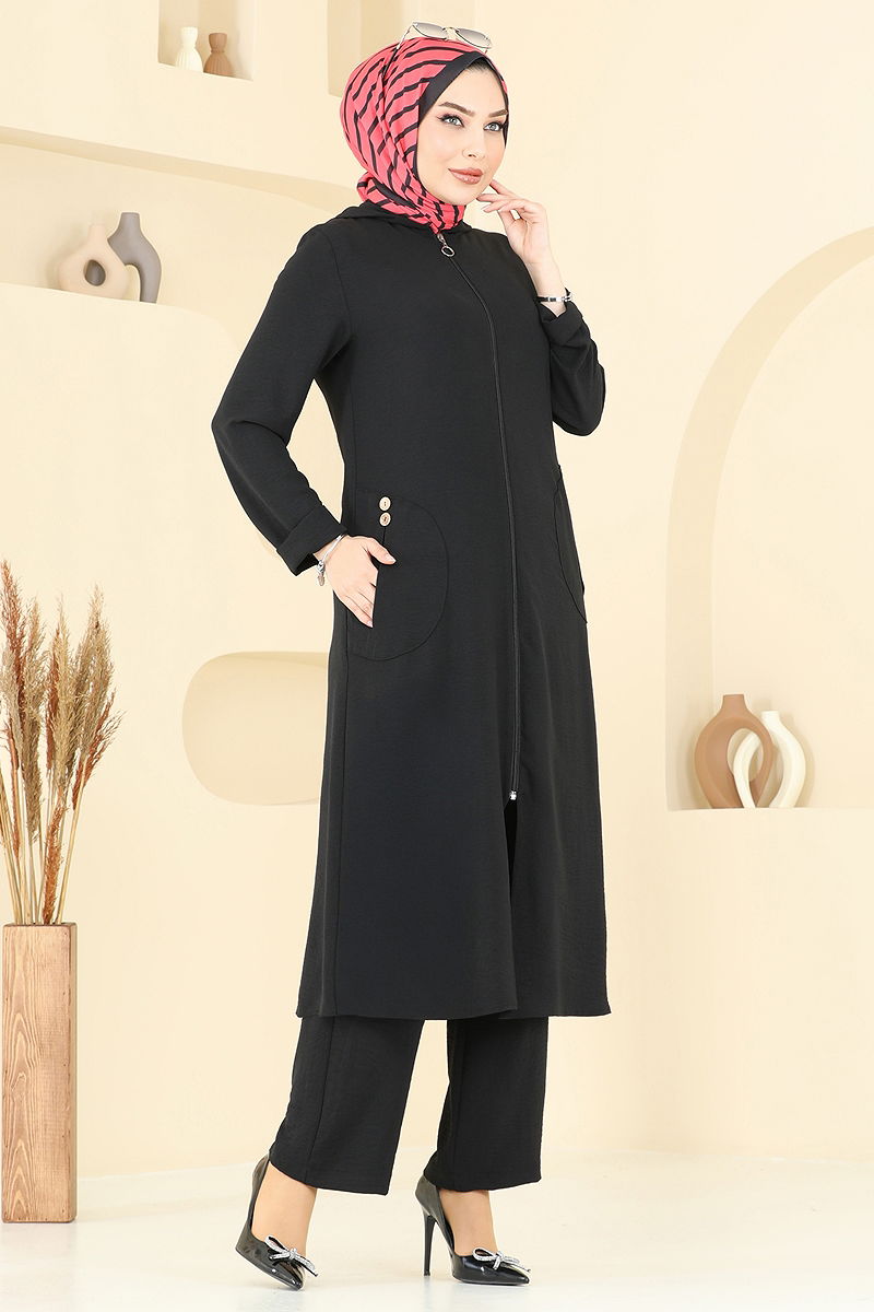 Ürün Özelliği : Yeni sezon tesettür moda ürünüdür. Ürün Kapşonlu yakadır. Astarsızdır. Ürün Önden fermuarlıdır. Kapşon ürüne dikilidir. Düğmeler aksesuardır. Bluz ürüne dahil değildir. Ürün kullanım amacını göstermek için bluz ile örnek kombin yapılmıştır. Cep mevcuttur. Pantolon beli lastiklidir. Konsept fotoğraf çekimlerinden dolayı üründe ton farklılığı olabilir.