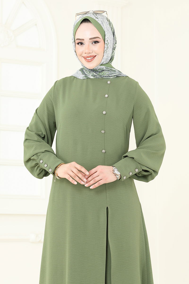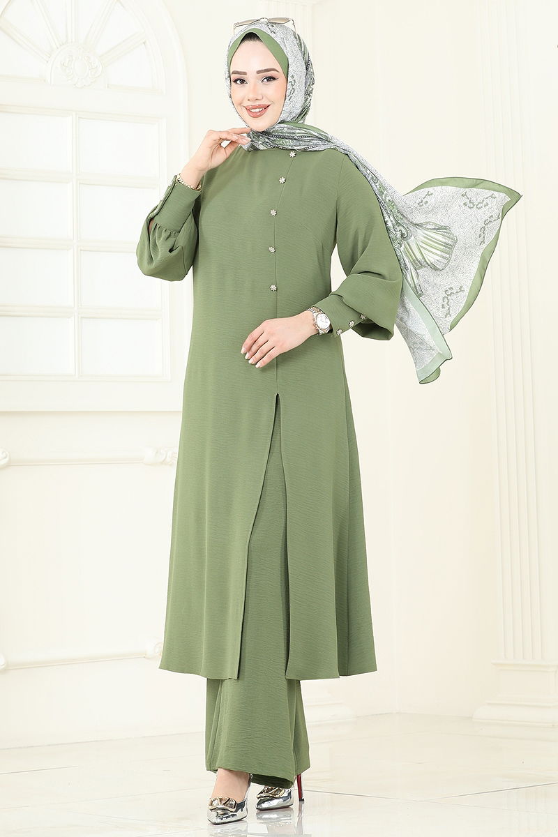 Product Feature : It is a new season hijab fashion product. The product has a Cycling collar. The tunic has a front slash.. Unlined. The product has a zipper at the from the back part. Buttons are accessories. The waist of the trousers is elastic. Cuff buttons are active. There may be a tonal difference in the product due to concept photo shoots.