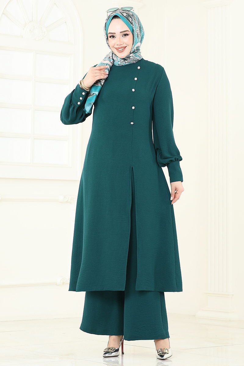 Önden Yırtmaçlı Tesettür Takım Petrol