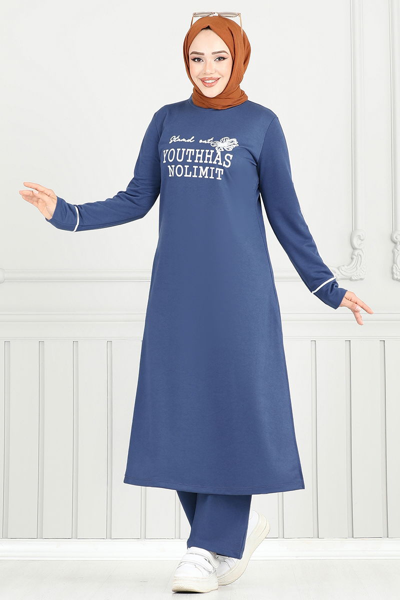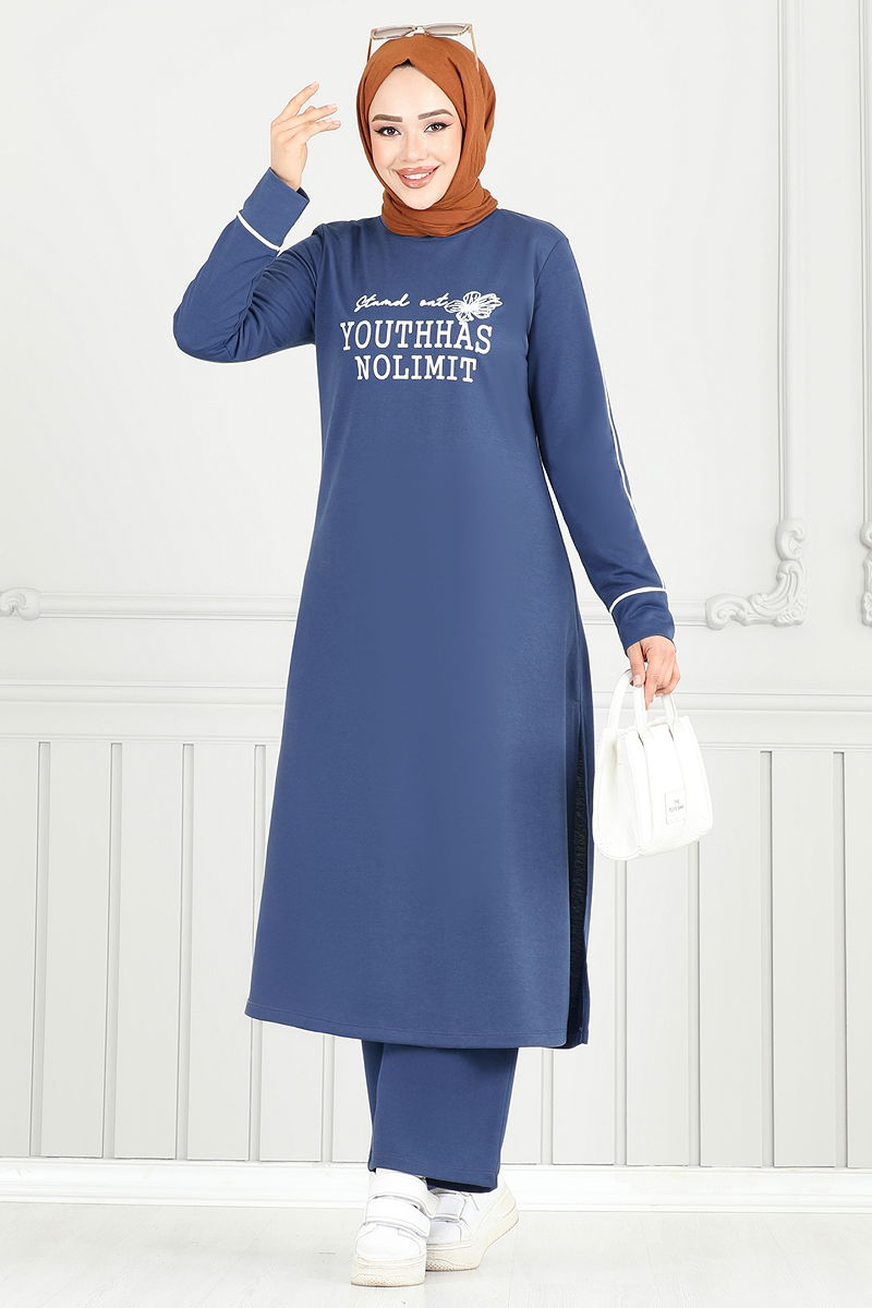 Önü Baskılı Tesettür Takım İndigo