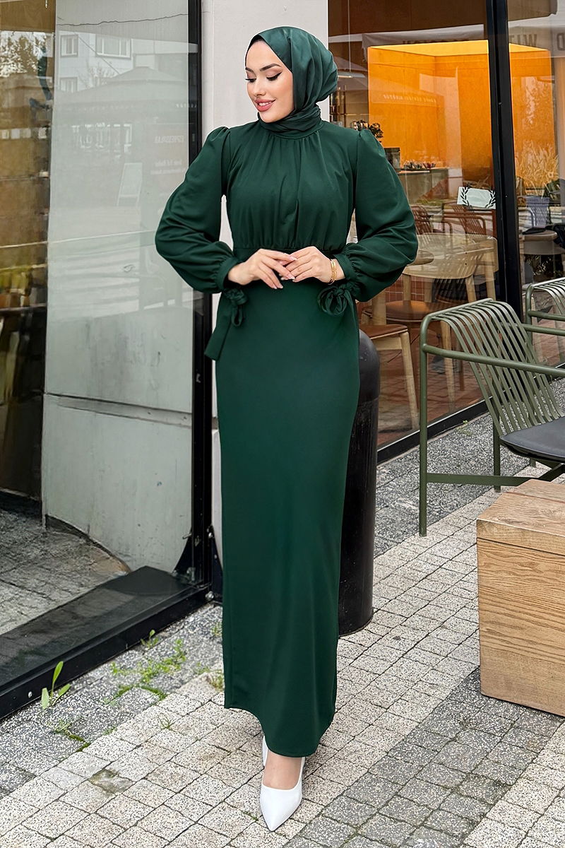 Bu şık ve modern tesettür elbise, her mevsim rahatlıkla kullanabileceğiniz drapeli ve krep kumaş bir tasarıma sahiptir. Hassas 30 derecede yıkanabilir özelliği ile uzun ömürlü kullanım sunar. Yarım hakim yaka ve sırttan fermuarlı yapısı ile pratik bir kullanım sağlar. Astarsız olan bu elbise, beli dikişli ve manşeti bağcıklı detayları ile zarif bir görünüm sunar.